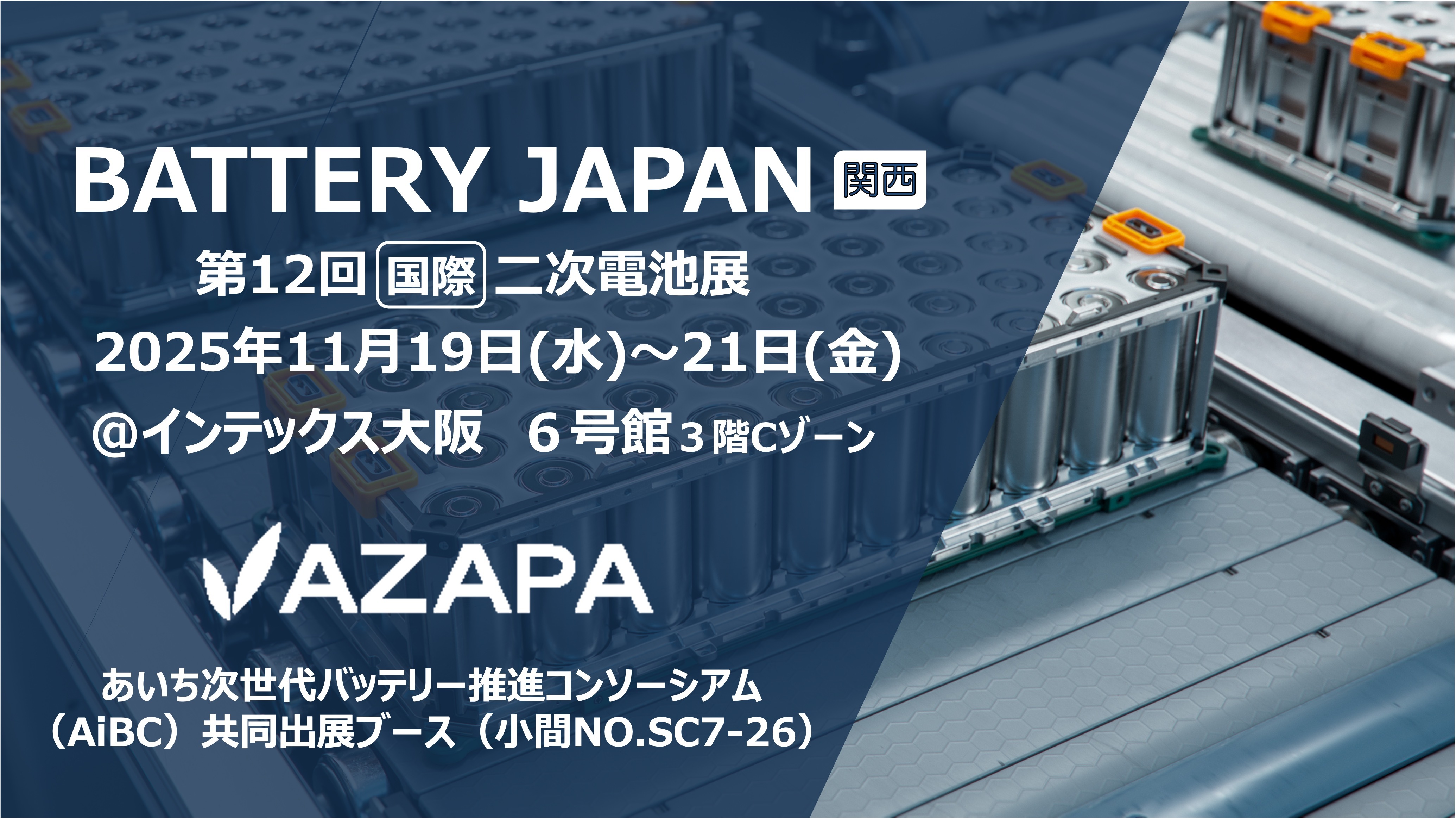 AZAPAは、第12回[国際]二次電池展(BATTERY JAPAN 関西展)に、あいち次世代バッテリー推進コンソーシアム(AiBC)様のブースにて出展します。