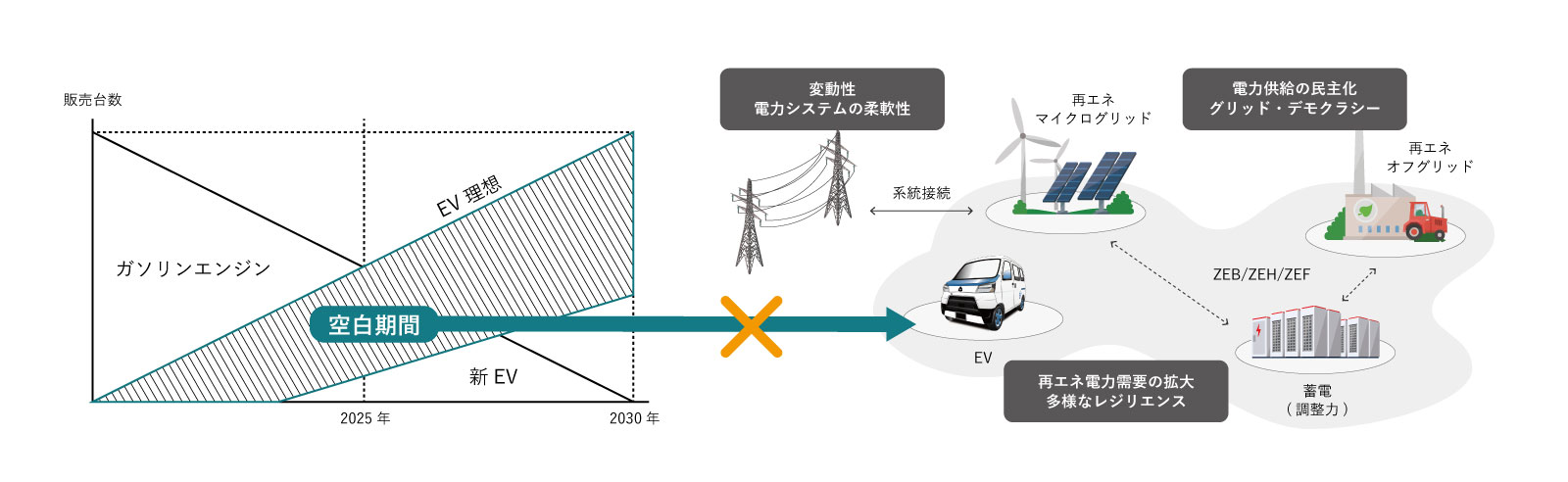 問題の核心は、車の販売台数が伸び悩むことではなく、この『空白期間』の存在が、将来の多様なレジリエンス や、再エネ電力の需給調整を担う「動くエネルギー源」となるはずのBEVが、モビリティとエネルギーの融合そのものを停滞させてしまっていることなのです 。