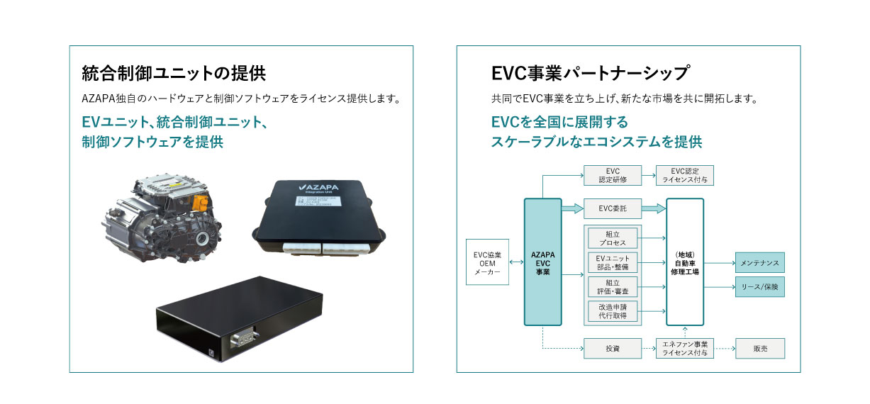 AZAPAは現在、この『EVC』を用いた次世代のモビリティ・エネルギー基盤を共に構築・展開していただける、地域の整備工場様、リース事業者様、そしてエネルギー課題に取り組む自治体・企業様とのパートナーシップを広く募集しています。