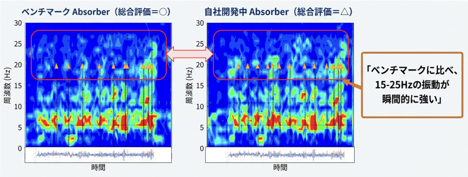 また、乗心地という感性において特定の周波数領域の振動が優劣に大きく影響していることがありますが、その差が発生する瞬間・瞬間を捉えることと、その瞬間に振動伝達メカニズムの動きがどうなっているかを紐解かなければ設計値にフィードバックすることはできません。