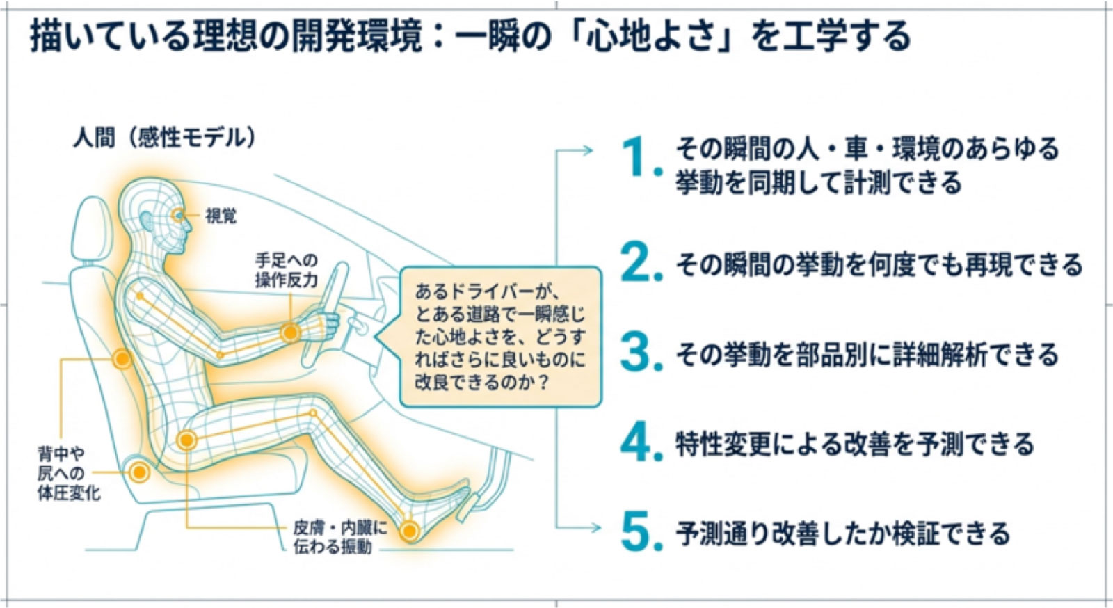 感性モデルを構築するには、まず人へのインプット(体感、視界等)とアウトプット(生体反応、評価コメント等)、人につながる車両や部品の挙動、車両に関わる環境の変化、等々を感性が変化する瞬間を逃さず全て同期して取得することが必要です。これは言うは易しで、非常に労力がかかるだけでなくコストもノウハウも必要で、計測設備が巨大になりすぎると車両の挙動にも影響して評価にならないということも発生します。